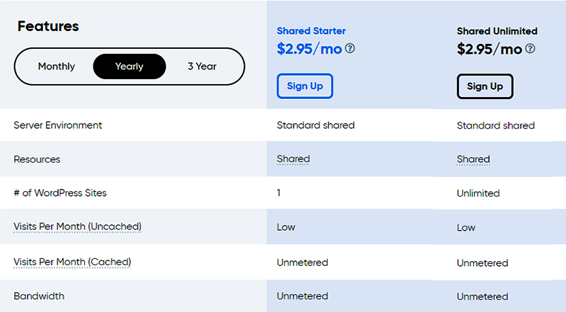 The Shared Starter plan is priced at $2.95 per month, which amounts to approximately ₦30,100 for the first year. This allows you to connect just one website, 50GB SSD storage capacity, and unmetered bandwidth. While these all sound great for an entry-level plan, there is a caveat with paying an extra $1.67/mo for @yourdomain Emails.