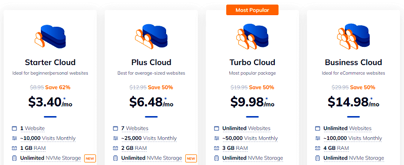 The Starter Cloud plan allows you to connect one website, an Unlimited NVMe storage with a limited database capacity of 250,000 website files, and approximately 10,000 monthly visitors.